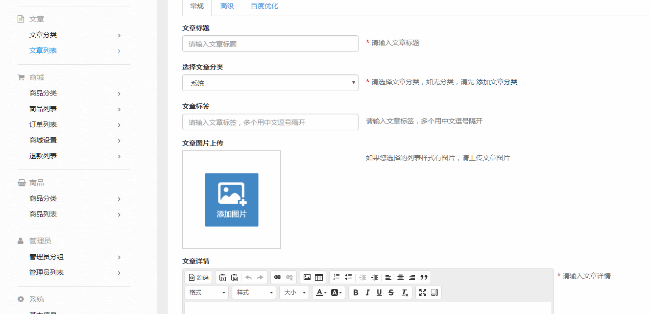 其中,可以对文章进行高级设置和百度优化。